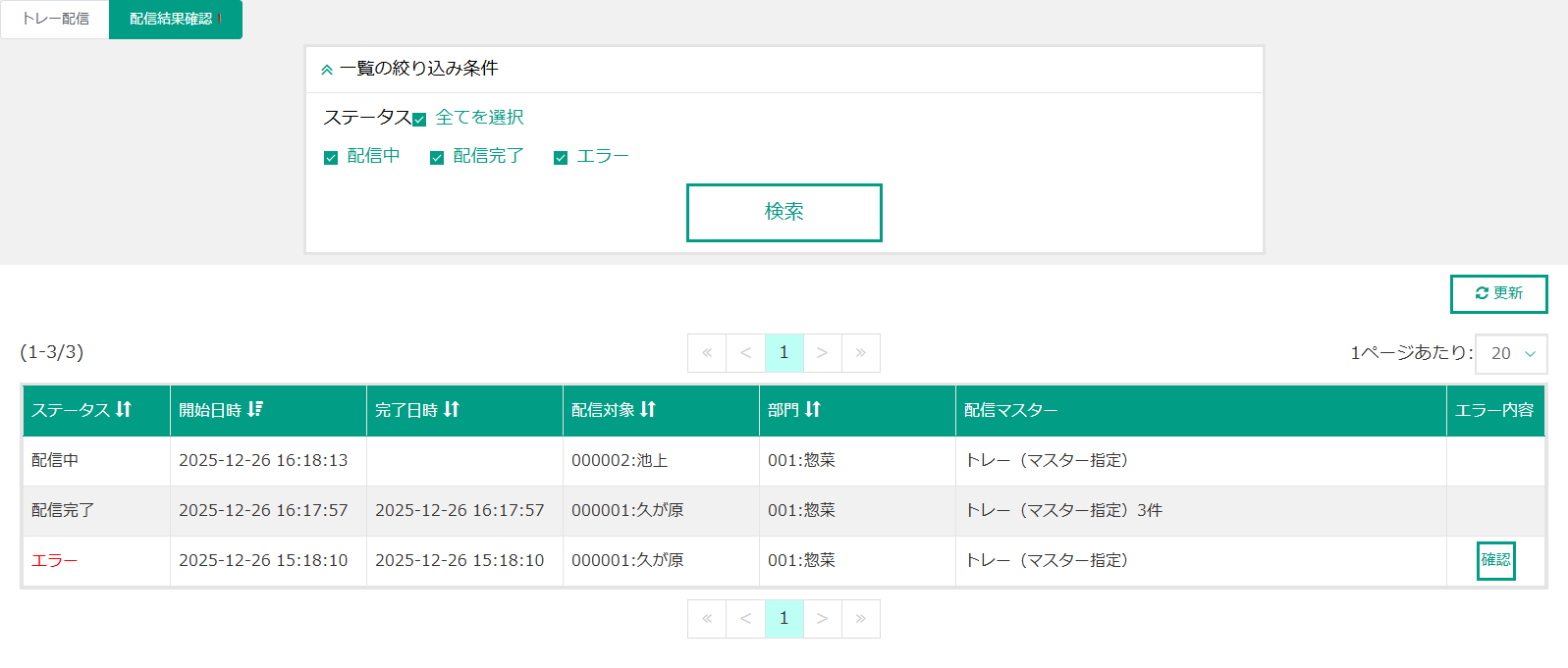 ステータスが「エラー」の配信の場合は「確認」ボタンが表示されます。 ※「確認」ボタンをクリックすると、エラー内容がポップアップ表示されます。 |