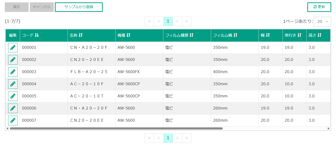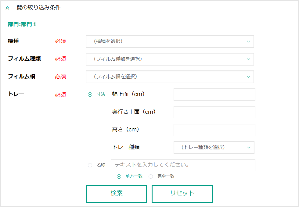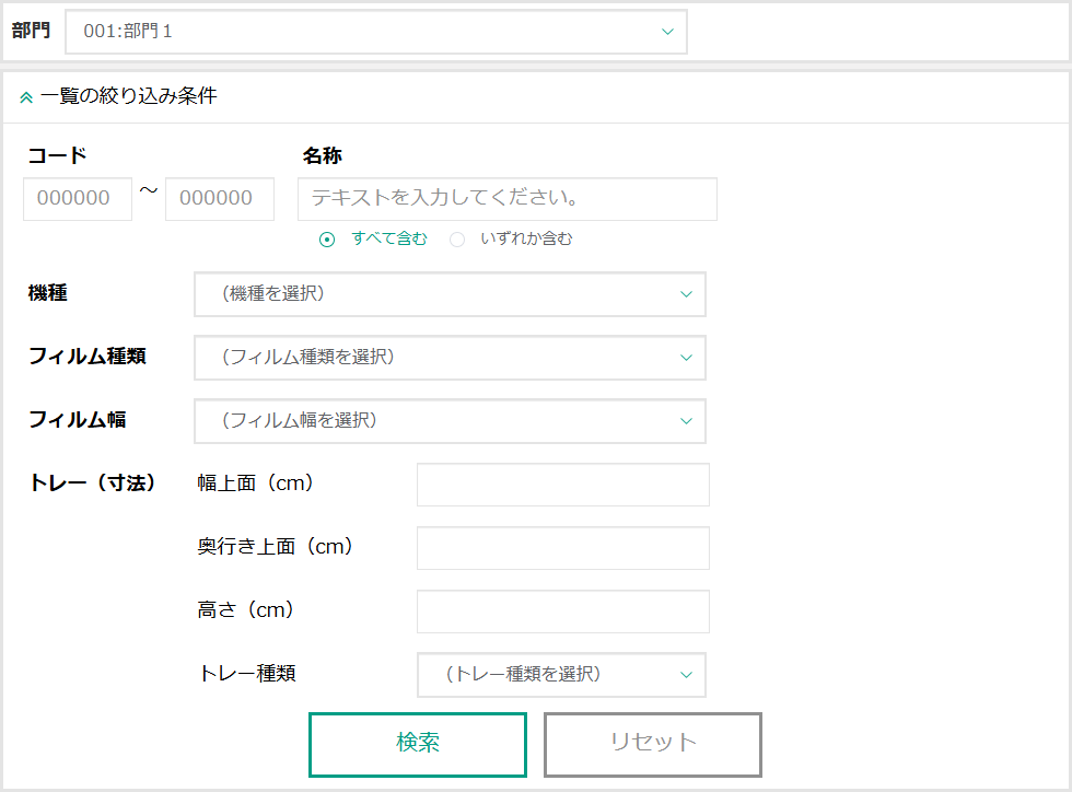 閲覧・改廃したいトレーテンプレートの、フィルム幅を指定して抽出できます。 ※機種、フィルム種類を選択すると、その機種、フィルム種類で登録されているフィルム幅が選択肢として表示されます。 |