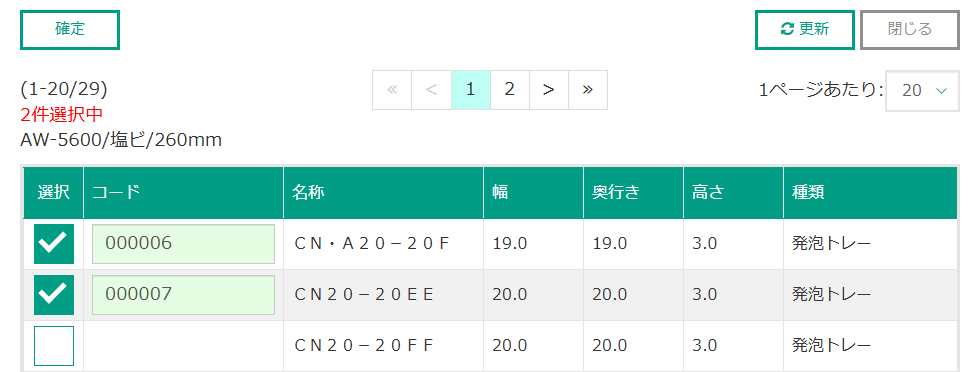 閲覧・改廃したいトレーテンプレートの、幅を指定して抽出できます。 ※指定した値±1cmの範囲で抽出されます。 |