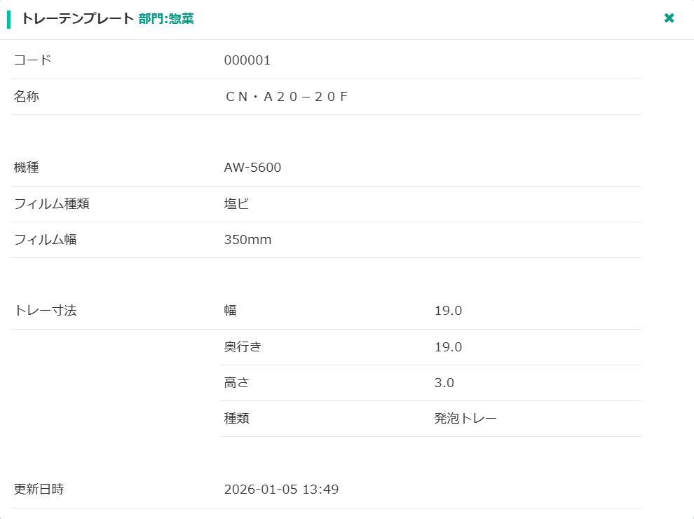 | 更新日時 | トレーテンプレートを最後に更新(追加、修正)した日時です。 | |
